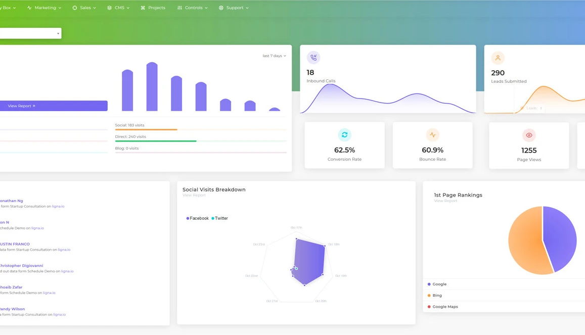 We built this software not only to market our clients, but also to provide them with the tools they need to manage their leads, automate lead follow-up,report on marketing and sales activity,manage their website, and engage in projects we perform with their business. We are now offering the following features without needing one of our marketing plans.